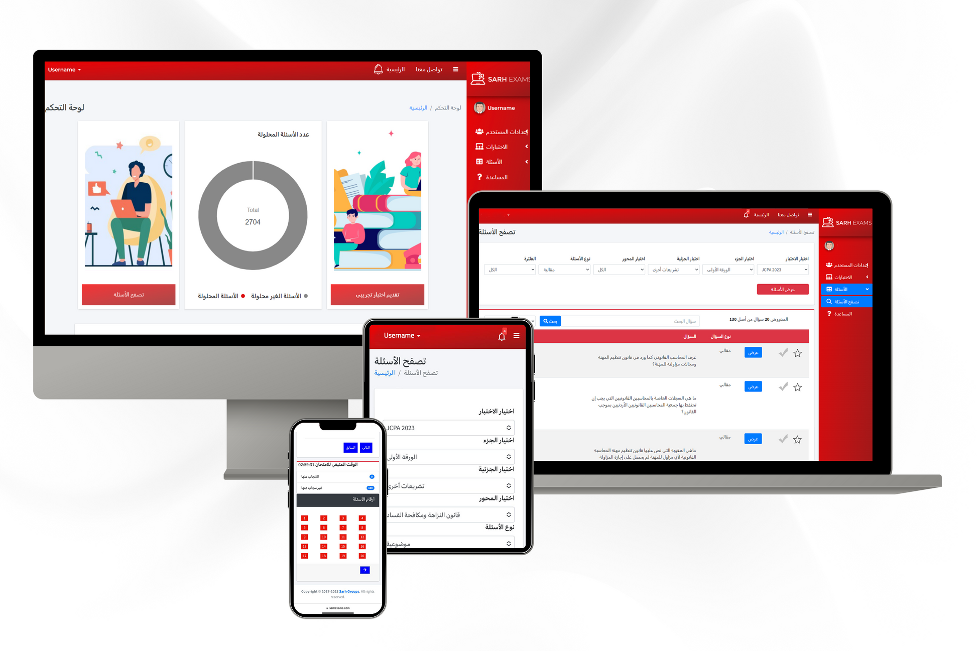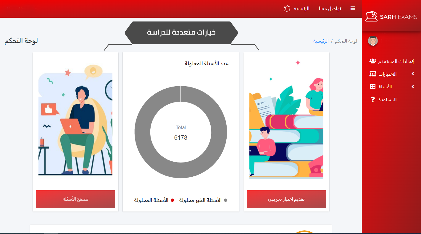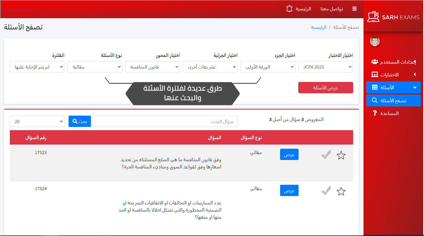 ٢. القاعدة مقسمة حسب الأجزاء والجزئيات مع إمكانية البحث عن أسئلة معينة أو كلمات مفتاحية أو تحديد أسئلة لم يتم حلها من قبل أو التي تم حلها بطريقة خاطئة.